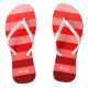 Une paire de tongs avec des nuances monochromes cool de couleur rouge rayures motif et une impression de nom personnalisable en lettres blanches.
