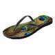 Une paire de plumes Peacock Flip Flops avec une photo de quelques belles plumes de paon détaillées. Marchez avec style. Vous pouvez le customiser en changeant la largeur de la sangle et la couleur, sur la droite. Bonne personnalisation !