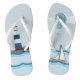 Des tongs avec une scène nautique d'un voilier naviguant dans un océan ondulé avec une montgolfière au-dessus flottant passaient devant un phare.