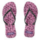 Des tongs tendance féminine avec un motif design en tache léopard rose, personnalisable en ajoutant votre nom en lettres blanches sur un étiquette violet