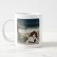 A textured painting with a viewfinder frame of a mermaid basking in the sunlight on a beach.