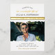 Gold foil life celebration invitation, featuring a photo of your loved one and a tasteful typography in a combination of black and gold foil against a white background. Photo funeral invitation with text in black and gold foil. Elegant memorial service invitation in black, white, and gold personalized with a photo of your loved one.