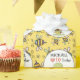 Cute cartoon tortoise holding a pink love heart balloon. He has a green head and legs, a yellow body, a brown shell and an adorable face. Next to him is a small happy yellow flower. The edge is yellow with a bee pattern. Templates to add the birthday name and age.