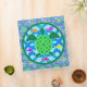 Une tortue de mer verte avec la coquille modelée, contre une eau bleue/motif de vague, avec plusieurs poissons colorés. Conception circulaire avec une frontière verte.
