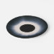 Near black and white artistic view of a total solar eclipse, showing the bright glow of the sun’s corona radiating from behind the blocking image of the full moon.