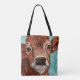 En jouant aux grands yeux, le veau orne cette mignonne aqua fourre-tout . Cela rend amusant le chargement des épiceries au magasin ! L'image provient d'un tableau original de l'artiste vaches Kathleen Meador.