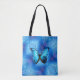 A beautiful Blue Morpho Butterfly. The background is a print inspired by the colours of the blue Himalayan poppy.
