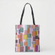 Ce sac fourre-tout a un design moderne boho de rectangles attachés à des lignes verticales de différentes tailles et des couleurs rétro.