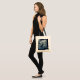 Un sac fourre-tout avec la photo d'un cerf royal avec des bois debout dans une forêt ombragée au milieu des arbres ensoleillés. Neige tombant tout autour.