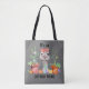 Ce sac fourre-tout est orné d'une adorable autruche qui porte un arc rouge et blanc et des lunettes de vue derrière une rangée de plantes et de fruits en pot colorés. Le texte en noir au-dessus et au-dessous de l'image dit "C'est une Ostrich Thing". L'image et le texte sont placés sur un arrière - plan gris moyen des deux côtés du sac.