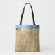 Sacs fourre-tout avec photo de paysage rural d'été. Nous voyons des champs de blé jaune sous le ciel bleu. Un accent rustique à votre tenue, un cadeau élégant pour les amoureux de style champêtre. Vous pouvez remplacer le texte "Pain quotidien" par votre propre message ou le supprimer. Pour d'autres modifications (style de police, couleur de police, position du texte), cliquez sur "Modifier la conception".