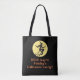 Joli et drôle personnalisé Halloween sorcier sac fourre-tout bonbon. Customisé pour votre petit astuce ou traiteur ! Sorcière volant sur un balai devant une pleine lune. Le texte d'une citation orange est "La façon sorcière de (nom personnalisé) de bonbons d'Halloween ?" Arrière - plan noir. Idéal pour les fêtes de Trick ou de Traitements ou d'Halloween !
