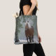 Sac fourre-tout avec la photo d'un cheval brun avec une longue crinière blanche et scrupuleuse. Debout dans une forêt avec des flocons de neige qui tombent tout autour.