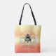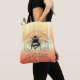 Un graphisme illustré sauver le sac fourre-tout abeilles avec une bannière qui dit : miel faire liste, dans un style sombre terreux de sable brun clair et corail clair et désespéré, avec une abeille floue et une police de caractères de style lettré à la main.