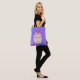Un sac fourre-tout avec l'illustration d'un cupcake délicieux. Le gel rose et les gouttelettes de chocolat. Porte-cupcake jaune et framboise sur le dessus. Yummy ! L'arrière - plan est une texture abstraite violette avec des petits coeurs partout.