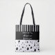 Créez un sac fourre-tout de devis personnalisé ajoutez votre propre devis sur des points noirs et blancs en gras et des motifs rayés dans un style chic moderne sur toute l'impression.