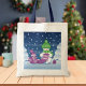 Illustration vectorielle de deux adorables bonhomme de neige en caricature vêtu de casquettes et de foulards tricotés. Le grand bonhomme de neige rusé est tricot une écharpe surdimensionnée pour le petit. Le foulard est déjà enveloppé plusieurs fois autour du mignon petit bonhomme de neige.