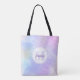 Sac fourre-tout avec un beau motif abstrait. Le violet, le rose et le blues mélangent, mélangent et coulent ensemble pour créer un design abstrait d'aquarelle élégant et magnifique. Un cercle blanc superposé avec votre nom et votre monogramme initial à l'intérieur.