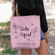 Sacs fourre-tout roses girly pour vos faveurs de fête de bachelorette avec des croquis de filles de fête glamour se faisant bronzer dans des verres à cocktail, des étoiles scintillantes, "Babe Squad" dans un script rétro tendance et le lieu de la fête ou autre texte en lettrage simple et moderne.