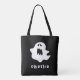 Sac fourre-tout d'Halloween amusant pour mettre en vedette un fantôme blanc éffrayant et un nom personnalisé ci-dessous.
