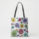 Ce sac fourre-tout a un design scandi de fleurs faites de cercles, ovales, et demi-cercles avec des éclats d'étoile sur eux et feuilles en perwinkle, jaune, vert, turquoise, magenta, rouille et bleu.