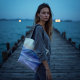 LUVINK Moderne Luxe Côtier. Twilight Drift présente des bandes en couches de lavande-crépuscule et des vagues profondément turquoises avec des reflets subtils de pêche-éclat sur un fond de sable. Les houles rythmiques évoquent le calme des marées du soir. Cet élégant fourre-tout est parfait pour les jours de plage, les courses de marché, ou ajouter une touche côtière artistique à votre portage quotidien.