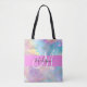 Nom monogramme irisé holographique de l'arc-en-ciel et sac fourre-tout initial. Votre nom personnalisé et votre monogramme sont écrits dans un élégant script écrit à la main avec un arrière - plan rose. Un cadeau d'anniversaire ou de Noël parfait !