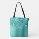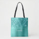 Customisez le script de style manuscrit moderne pour créer votre propre sac d'achat avec un imprimé sur tout. Ajoutez une initiale de monogramme pour créer une combinaison initiale de prénom. Parties scintillant bleue turquoise fillette sur un papier d'aspect en métal brossé turquoise. La feuille, les étincelles et la parties scintillant sont des arts numériques qui s'impriment comme une photo.