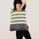 Un sac fourre-tout motif à rayures horizontales et modernes en vert poivre et écrou brun. Personnalisez en ajoutant votre nom sous le logo chic de la marguerite rétro.