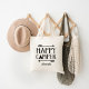 Sacs fourre-tout imprimés personnalisés avec la typographie "Happy Camper" en noir et blanc tendance, guillemets personnalisés avec votre nom monogramme ou autre texte. Le design comporte une bordure de flèche tribale et un graphique de tipi mignon. Utilisez les outils de conception pour choisir n'importe quelle couleur arrière - plan, ajouter votre propre texte et photos pour créer un design unique d'un genre.