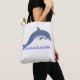 El elemento central es un delfín estilizado representado con un patrón que recuerda al arte, está saltando o nadando sobre un conjunto de olas vibrantes. Los colores predominantes son el azul turquesa, el azul marino oscuro y toques de blanco o un color de contraste, que destacan sobre el tela de otro color a crema, lino o blanco roto del bolso.