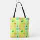 A fun tote with a colorful citrus fruit pattern of lemons, limes, oranges and citrus slices on squares of white, orange, teal and yellow.