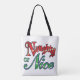De beaux sacs fourre-tout tout-en-un ! Disponible en deux styles et deux tailles ! Illustration vintage Joyeux Noël dessin animé clip art design de texte. Les mots "Naughty or Nice" écrits en lettres de couleur rouge et verte de Noël.