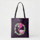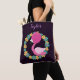 Un joli sac fourre-tout flamand, cet article est orné d'un arrière - plan violet profond avec une couronne fleurie colorée bleue et jaune. Un flamant rose est à l'intérieur de la fourre-tout. Votre nom peut être personnalisé en haut. Commandez les vôtres dès aujourd'hui ! Clipart : Conception de Prettygrafik (https://www.etsy.com/shop/Prettygrafikdesign)