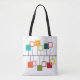 Ce sac fourre-tout au design moderne du milieu du siècle ressemble à un mobile avec des carrés solides et ouverts accrochés à celui-ci en turquoise, orange, vert, rouge et beige.
