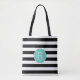 Personnalisez ce chic sac fourre-tout rayé noir et blanc avec votre monogramme initial unique sur un badge d'été en cercle d'aqua turquoise pour un fourre-tout qui est le vôtre ! Fait un grand cadeau pour les demoiselles d'honneur aussi.