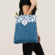 La partie inférieure de ce sac fourre-tout a un joli motif à points polka bleu et blanc. En haut se trouve un groupe avec un imprimé rose bleu sur un arrière - plan blanc. Les deux sections sont séparées par de minces bandes bleues foncées et une bannière ornée avec votre propre monogramme. Le dos du sac a le même design de pois avec la bande florale, mais sans la bannière ou le monogramme. Belle pour le printemps et l'été, et personnalisée pour vous!