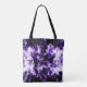 Personnalisez avec votre initiale et votre nom. Sac fourre-tout sur papier avec flammes triangles brillantes violet électrisant. Maille géométrique triangulaire violet, noir et blanc avec fumée abstraite et tirage étincelant.