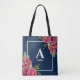 Tote Bag Monogramme Fleurs rouges et roses Bleu foncé Marin