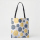 Ce joli sac fourre-tout personnalisé est l'arrière - plan d'un motif de fleurs doré, gris clair et bleu marine. En haut se trouve une bannière marine en cercle bleu qui est bordée de points jaunes et d'un mince cercle blanc. Au centre se trouve votre monogramme en blanc. Le dos du sac a le même motif floral, mais sans le monogramme. Belle pour le printemps et l'été, et personnalisée pour vous! Assurez-vous de voir les tongs correspondants dans notre magasin. Graphic Design crédit à Malachi Designs on Etsy.