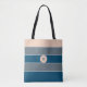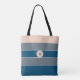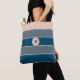 Tote Bag Monogramme Moderne Rayé Bleu Gris Pêche Chic