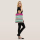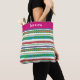Ce design tribal boho unique présente une variété de motifs ethniques clairs et audacieux aux saveurs aztèques, africaines et amérindiennes, comme les diamants, les spirales et les formes abstraites sur des bandes de différentes largeurs dans des couleurs fraîches et vives, dont le rose, le turquoise, le vert, l'or et le blanc. Le dessus du sac est un rose foncé assorti avec un nom personnalisable en blanc dans la typographie populaire. Vous pouvez personnaliser cet objet pour vous-même ou pour un proche en changeant son nom.