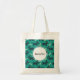 Sac fourre-tout à motifs avec un nom personnalisé à l'intérieur d'un cercle blanc. Conçu avec un motif extensible avec un mignon chien souriant avec un os. Arrière - plan vert.