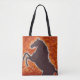 Parfait d'un sac aimable d'art pour occidental, cheval aimant des gallons. Le mustang de élevage de châtaigne est placé sur un fond contrastant de rouge orange ardemment.