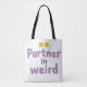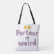 The image features the phrase "Partner in Weird" written in a playful, light purple font against a black background. The word "Partner" is emphasized with a bright yellow square and circle above it, drawing attention to the concept of partnership. The design conveys a sense of humor and camaraderie, suggesting that the individuals involved share a unique bond characterized by their quirky and unconventional nature. This message celebrates the idea of having a close friend or partner who embraces and appreciates one's individuality, even when it's unconventional.