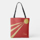 Sac fourre-tout élégant avec rayons du soleil sur arrière - plan rouge. Trois rayons émergeant du soleil sont trois aspects de la vie : le corps, l'esprit et l'esprit. Le texte ensoleillé peut être personnalisé.