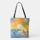 Design rond d'une scène de plage avec une petite île arborant un palmier et une planche de surf qui s'élève du sable, entourée de vagues bleues sous le soleil couchant. Ce sac fourre-tout est entièrement personnalisable.