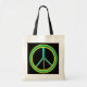 Ce sac fourre-tout présente le motif circulaire du symbole international de la paix. Les couleurs bleu, vert et jaune sur un arrière - plan noir créent un motif abstrait géométrique dramatique.