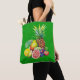 Bag in a collage of colorful tropical fruits including pineapple, papaya, mango, gogi berries, kiwi, and lime, with a tropical theme of rich textures and lush foliage.