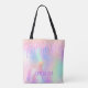 Un arrière - plan holographique branché aux couleurs pastel unicorne et arc-en-ciel rose, violet, vert menthe. Décoré avec des gouttes de rose et de violet. Une licorne de couleur arc-en-ciel. Personnalisez et ajoutez un nom, écrit avec un script de style à la main girly moderne. Lettres violettes.